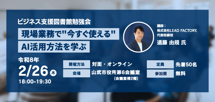 エコノミックガーデニング推進協議会主催による「ビジネス支援図書館勉強会」が令和8年2月26日(木)山武市役所 第6会議室(会議室棟2階)とオンラインにて同時開催されますので、ご案内申し上げます。
